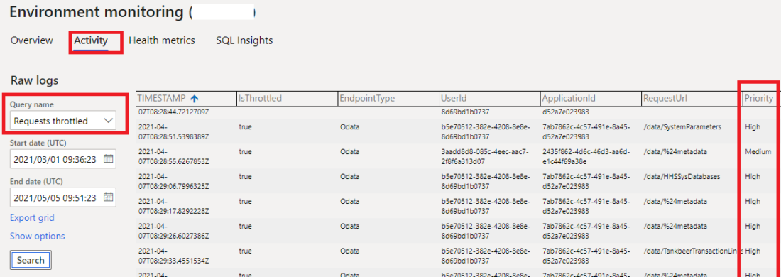 5.Then click on Activity, select “Requests throttled” query. Then select the range of date to see the thtottled requests.