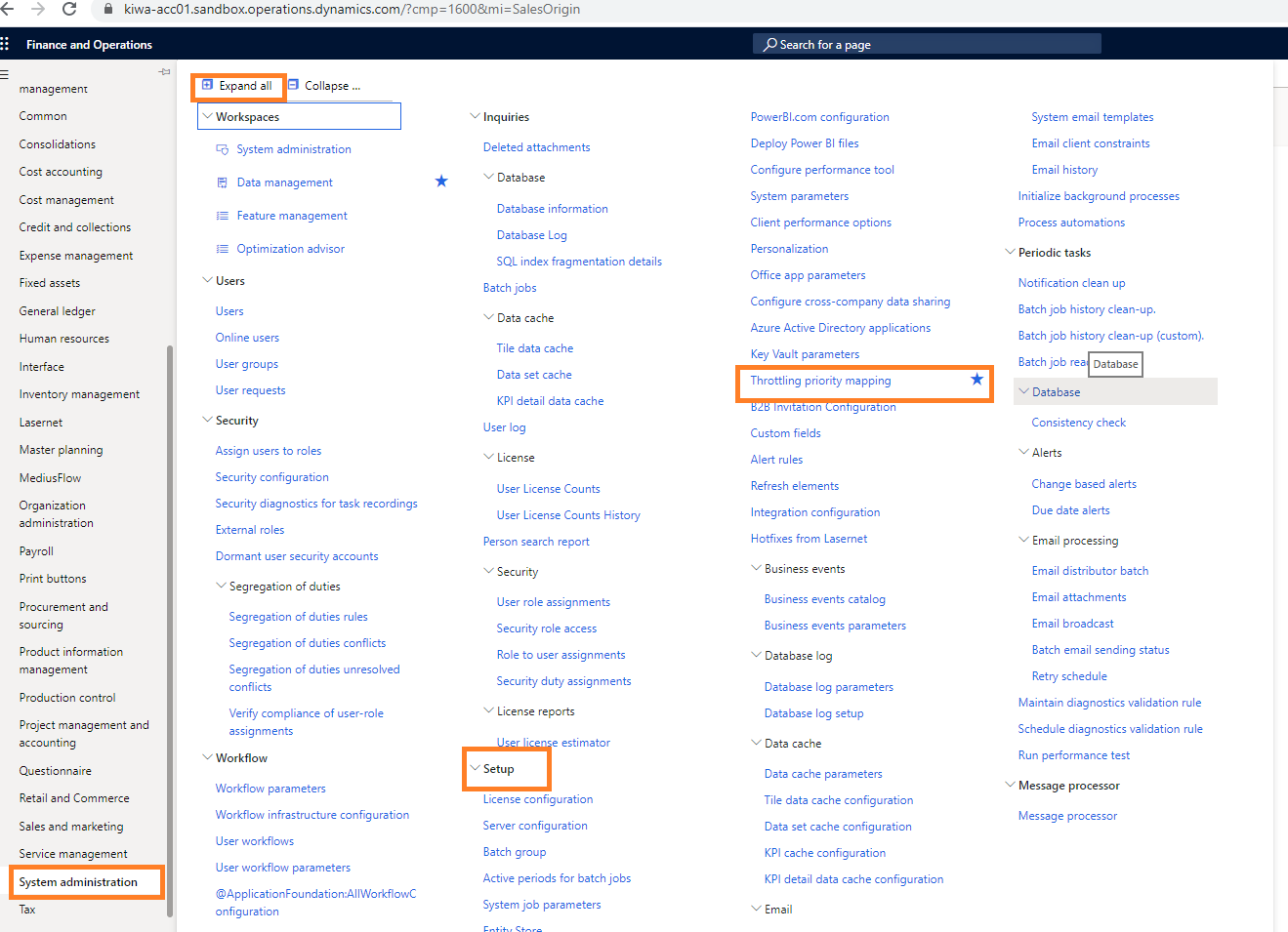 Log into D365FO with an administrator account. Then go to “system Administration“, then click expand all and click on “Throttling priority mapping” under setup.