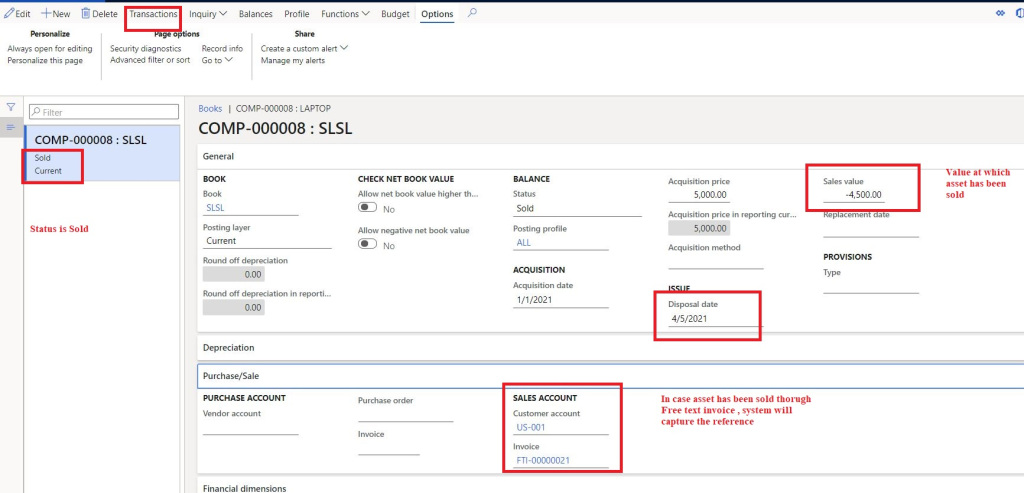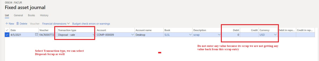 Note: As mentioned both has same impact it is just different transaction type, so I will demonstrate this with “Disposal-Sale” type of transaction, same can be done using Disposal-Scrap.