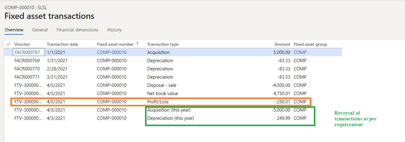 Example-1: We have one asset (60 Months life) worth 5000 which was acquire on 1st Jan 2021 and has been depreciated till March 31st, 2021 with net book value at 4750.01.