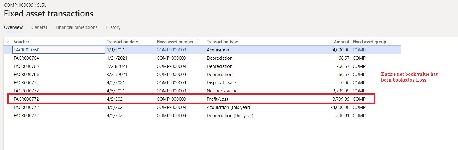 Example-2: We have one asset (60 Months life) worth 4000 which was acquire on 1st Jan 2021 and has been depreciated till March 31st, 2021 with net book value at 3799.99.