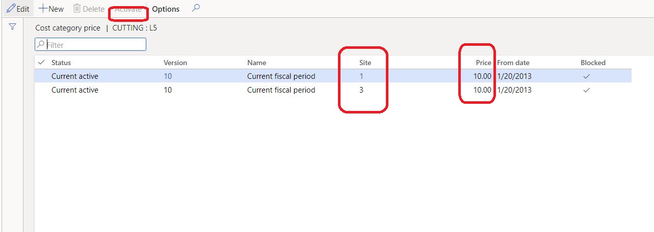 Production Control > Setup > Route > Cost Category > Price > New > Define price > Activate.