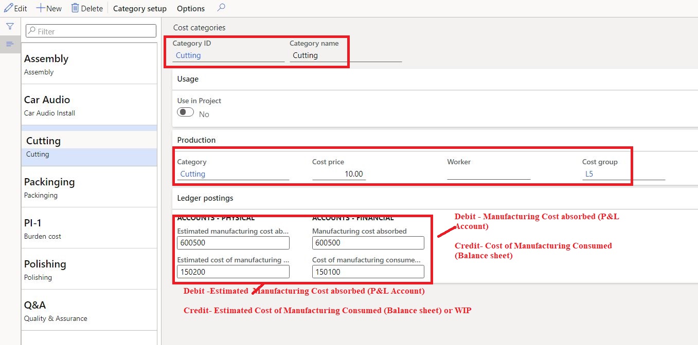 Each cost category has its associated cost records and an assigned cost group. Different cost categories are needed to support different production purposes.